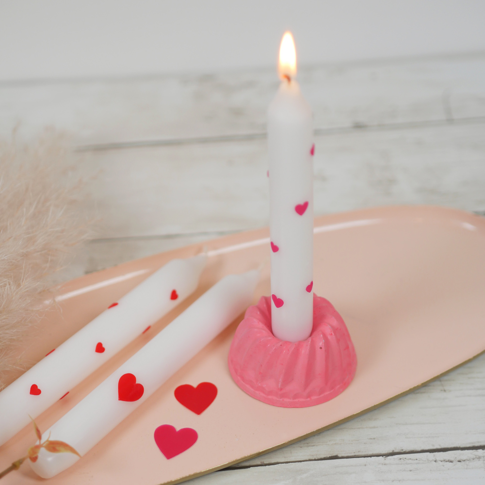 Die glatte Oberfläche der übertauchten Kerze sorgt dafür, dass selbstklebende Wachsplatten und feine Ornamente besonders gut haften. Die klassische weiße Farbe lässt rote Herzen oder goldene Akzente besonders strahlen.
