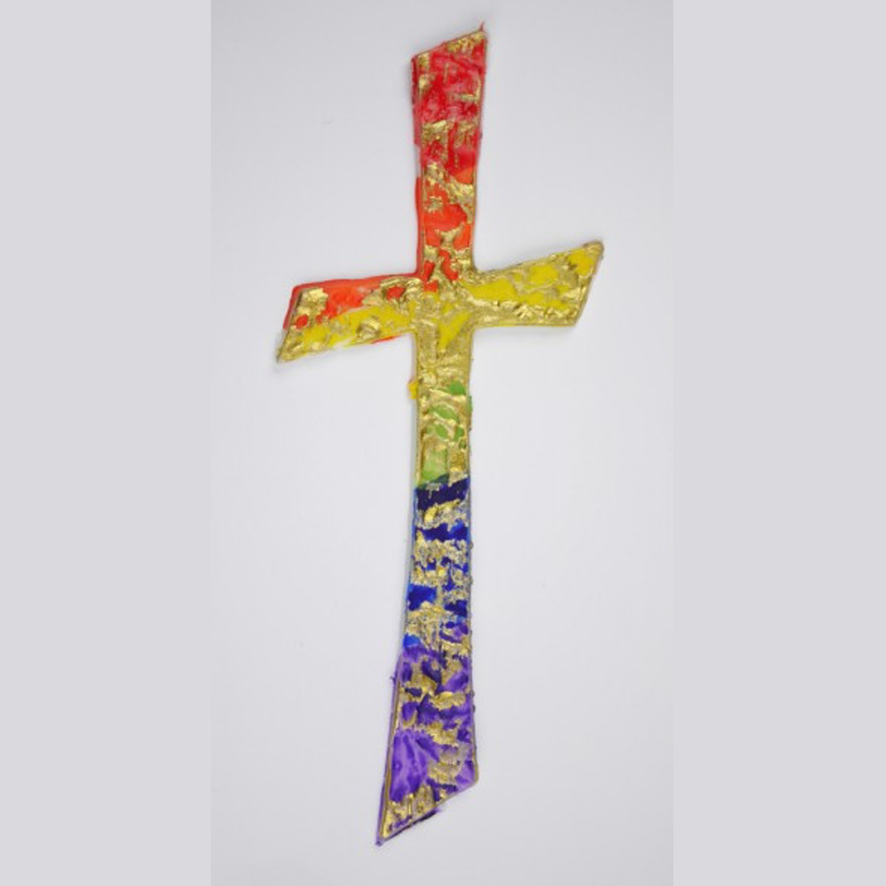 Wachsmotiv Kreuz in Regenbogen & Gold – handbemalt zum Kerzenverzieren